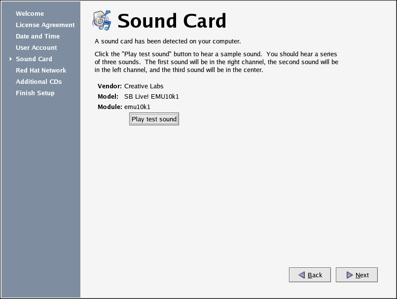 The Setup Agent probes your system for sound cards and attempts to configure the correct settings for use with Red Hat Enterprise Linux. You can then click the Play test sound button to play a sound sample. If you can hear the sample, select OK and your sound card configuration is complete.