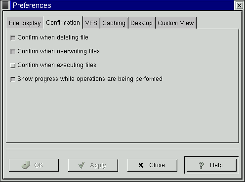 The GMC Preferences dialog is divided into Five major sections: File Display, Confirmation, VFS, Caching , Desktop, and Custom View.
